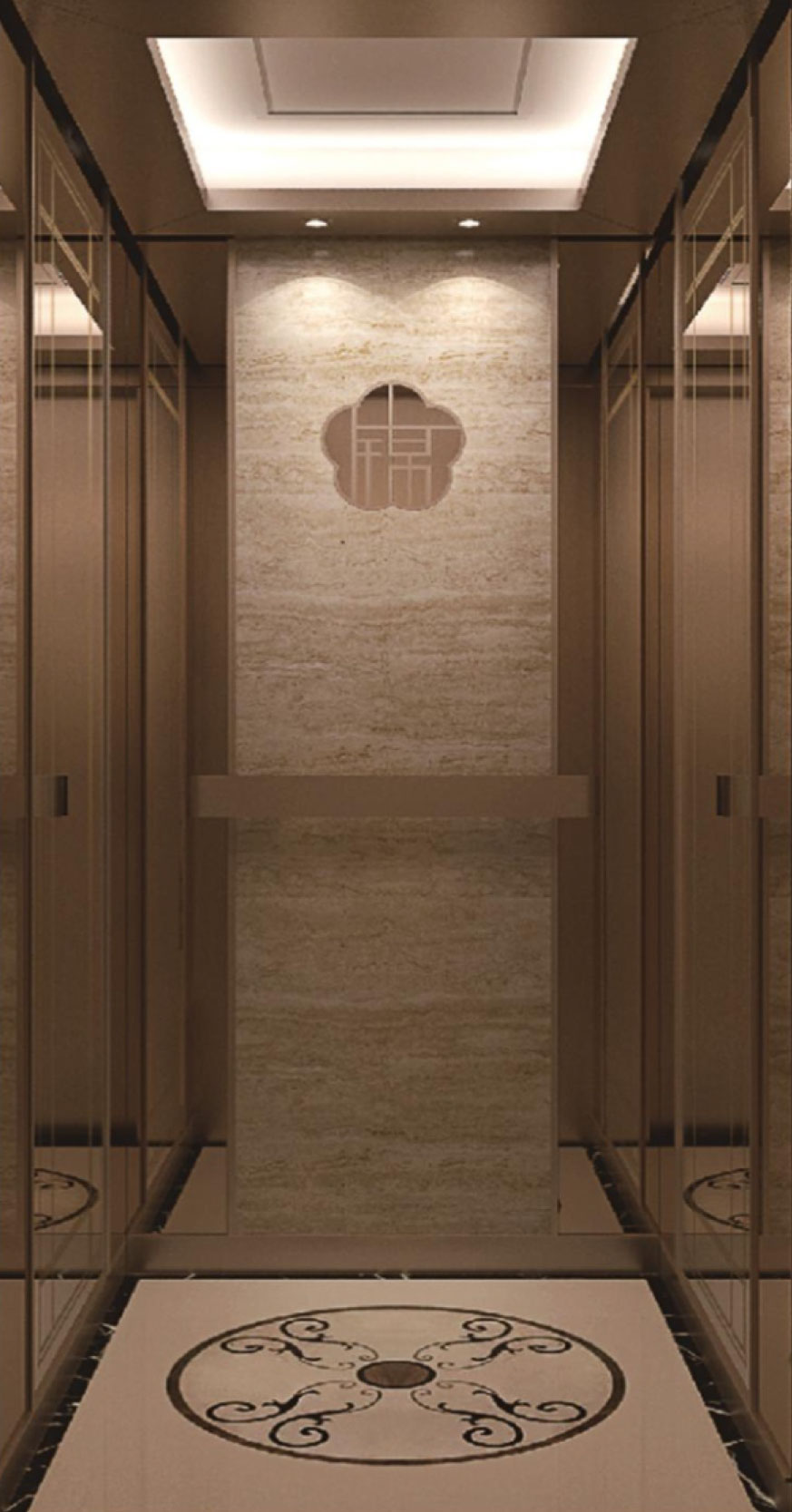 轿壁│大理石轿壁+玫瑰金发纹装饰条、玫瑰金镜面+玫瑰金蚀刻不锈钢