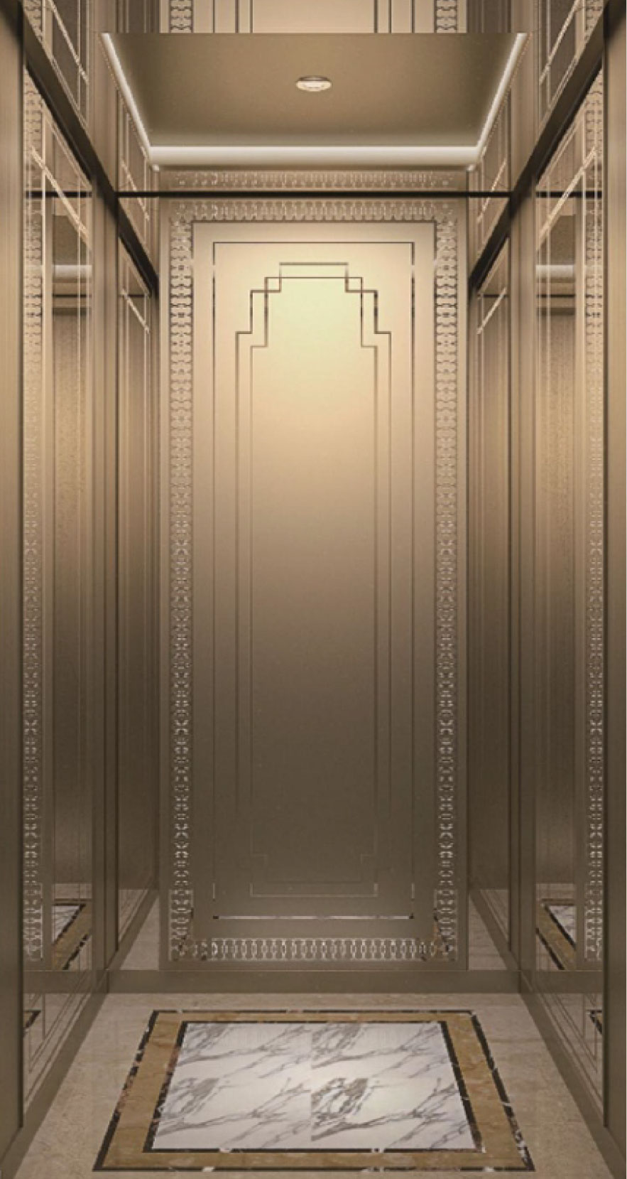轿壁 | 香槟金镜面蚀刻+香槟金镜面装饰条+香槟金镜面不锈钢