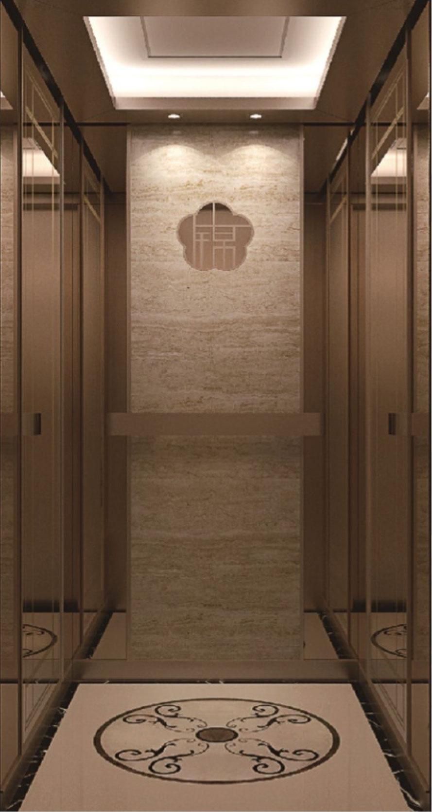 轿壁 | 大理石轿壁+玫瑰金发纹装饰条玫瑰金镜面+玫瑰金蚀刻不锈钢